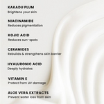 Formulated with Niacinamide, Kojic Acid, and Kakadu Plum Extract – well-known skincare ingredients often included in sunscreens and moisturizers.