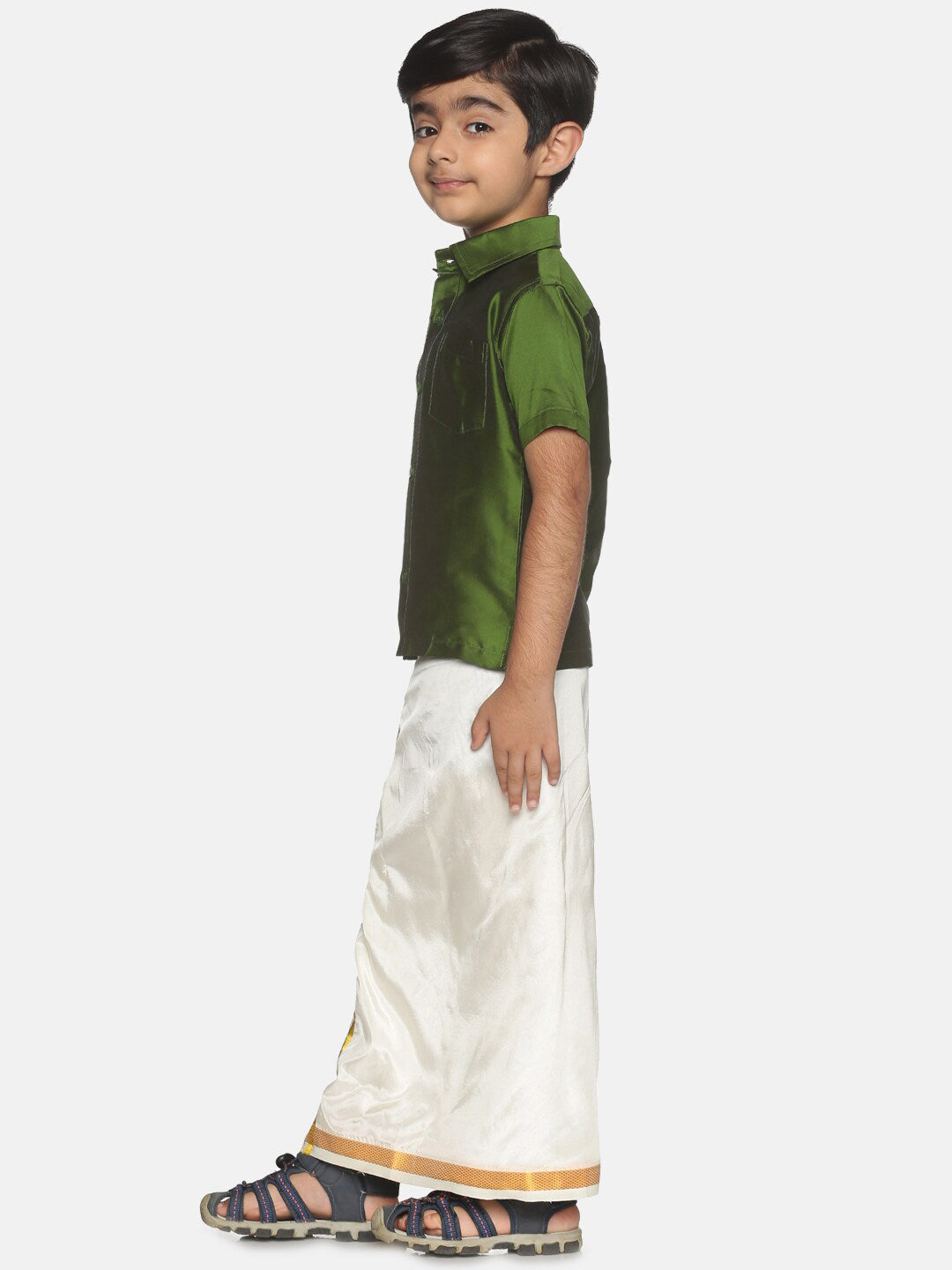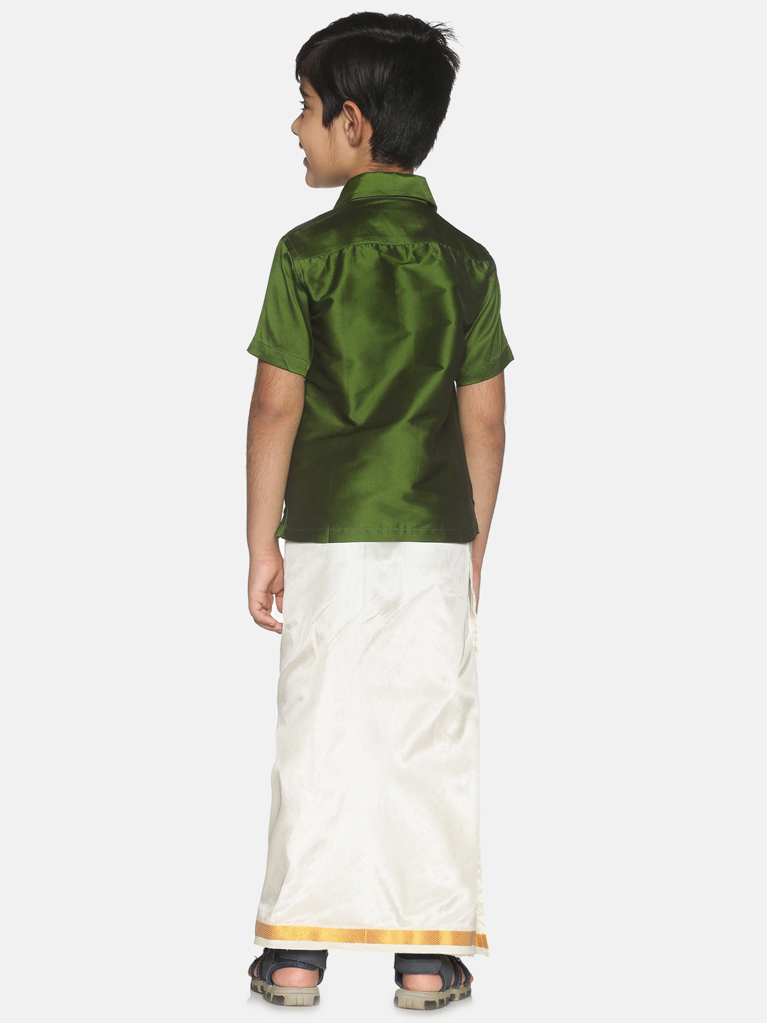 Sethukrishna Boys Green Shirt & Cream-Coloured & Zari Border Veshti Set Product Details This Co-Ord Set consists of Shirt and Green and...