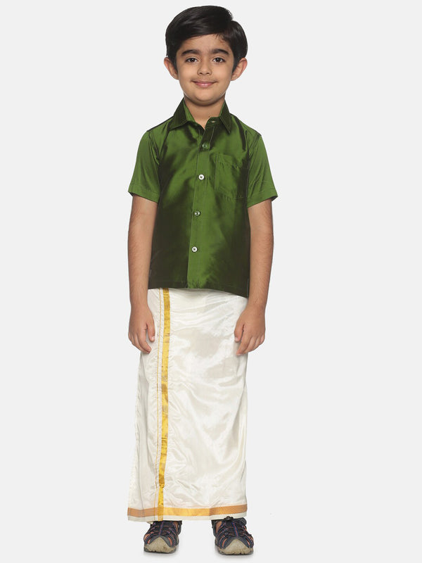 Sethukrishna Boys Green Shirt & Cream-Coloured & Zari Border Veshti Set