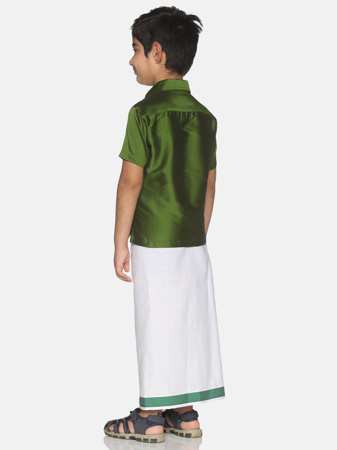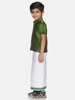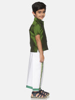 Sethukrishna Boys Olive Green & White Solid Shirt and Veshti Set