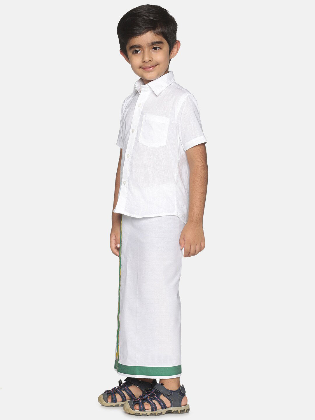 Sethukrishna Boys White & Green Pure Cotton Shirt with Dhoti Product Details This Co-Ord Set consists of Shirt and DhotiWhite solid Shirt ,h...