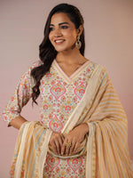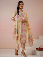 Janasya Beige Cambric Ethnic Motifs Kurta,Bottom & Dupatta - XS