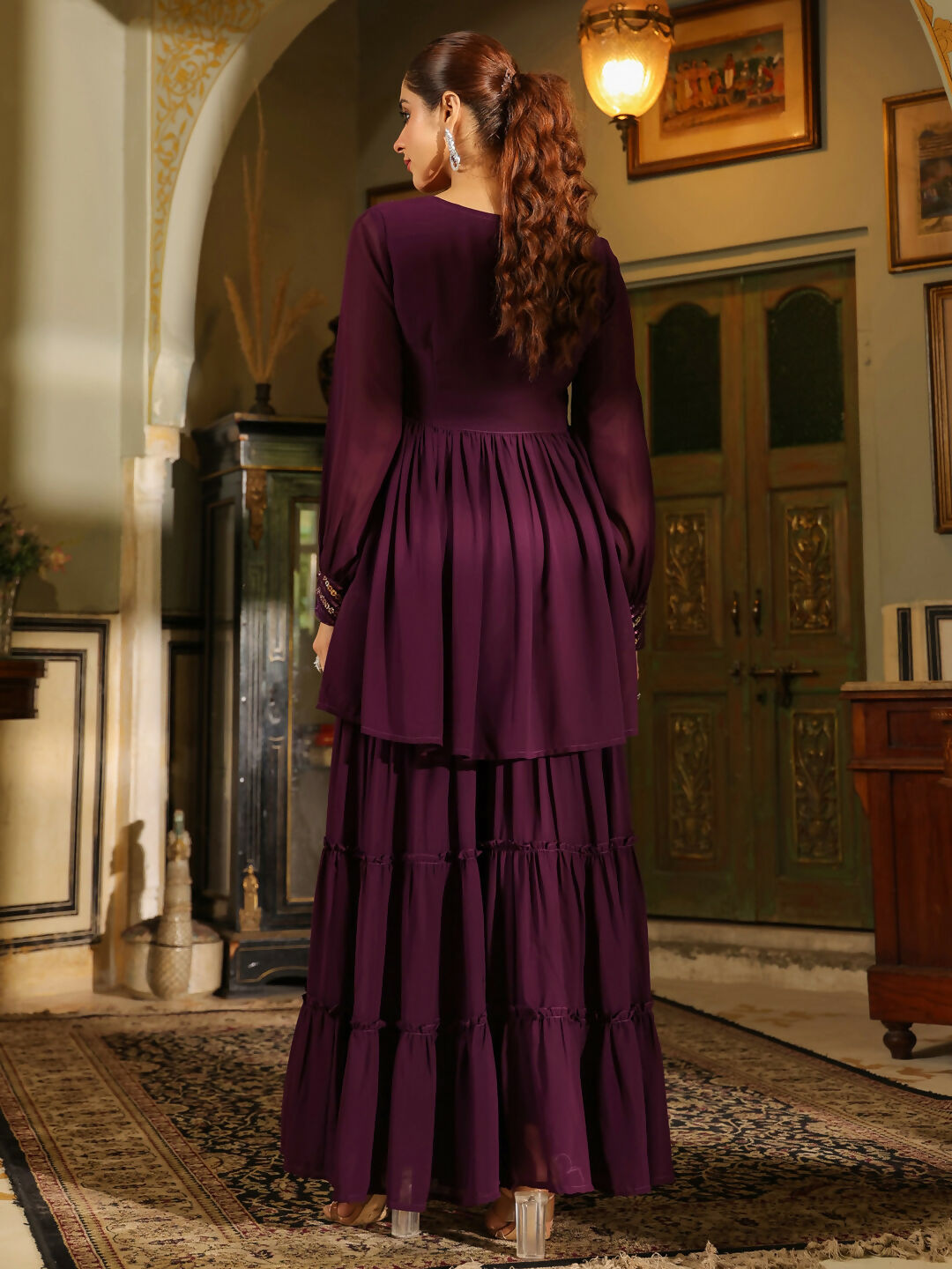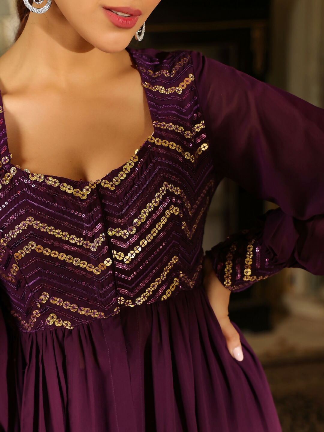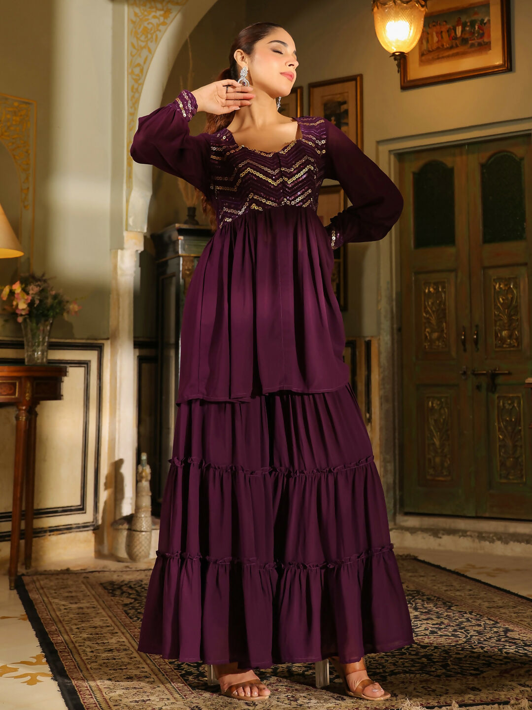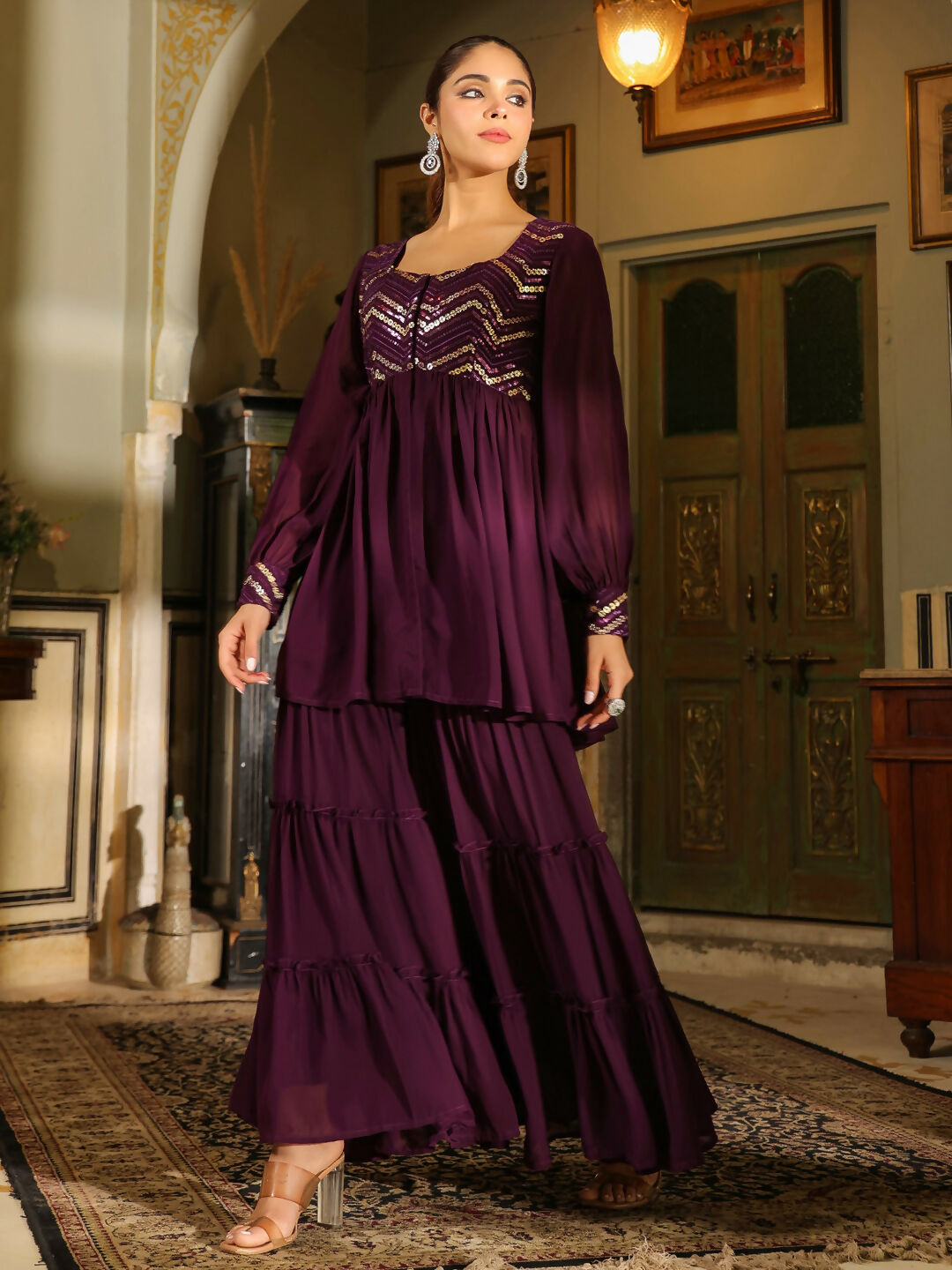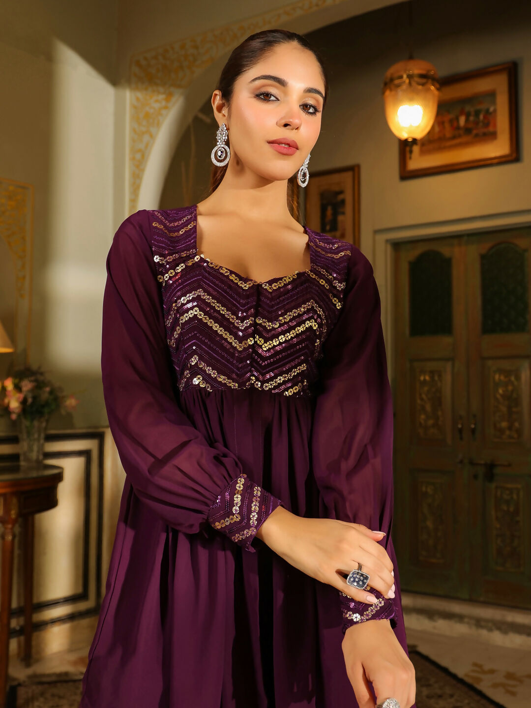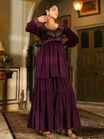 Janasya Purple Georgette Sequined Tunic & BottomAbout the Product: Package Contains: 1 Tunic :: 1 Bottom Top Fabric: Georgette Top Style Typ...