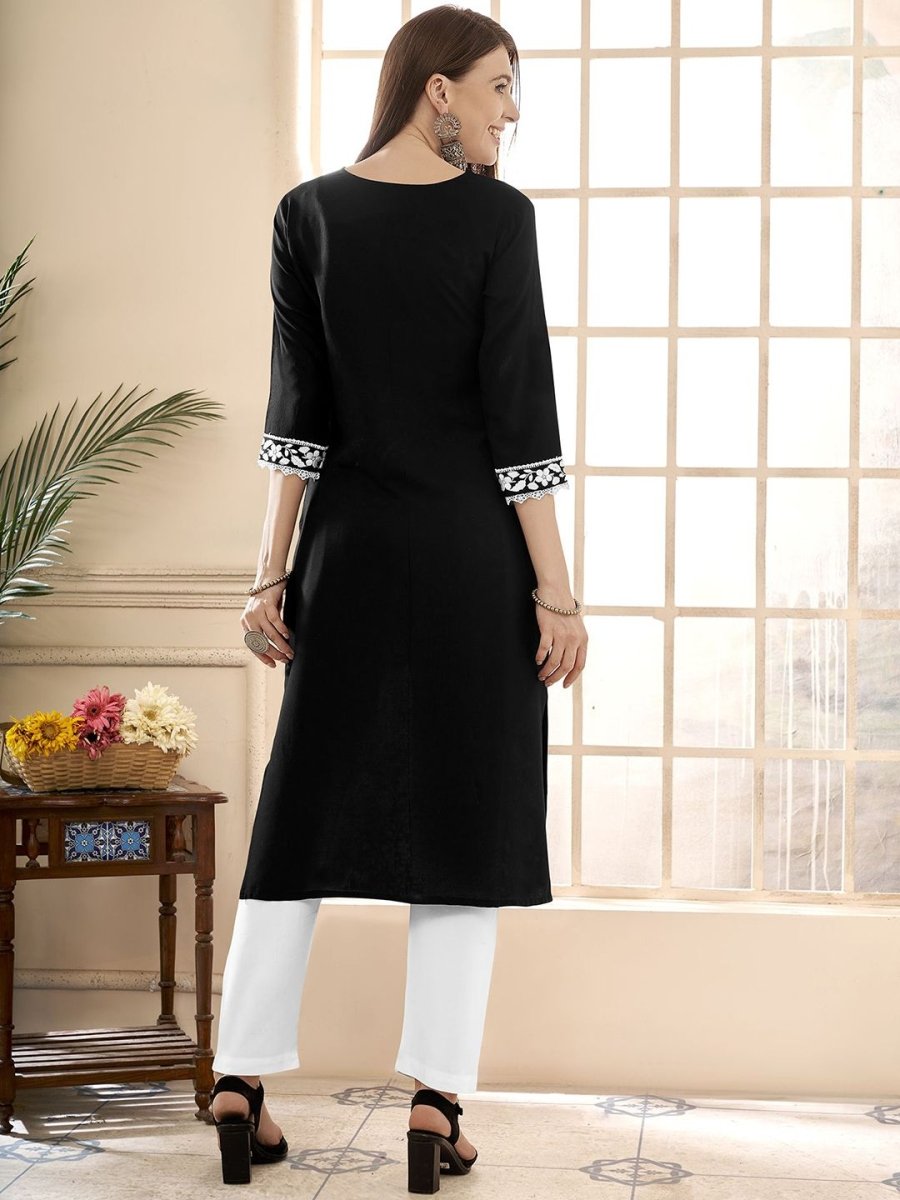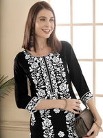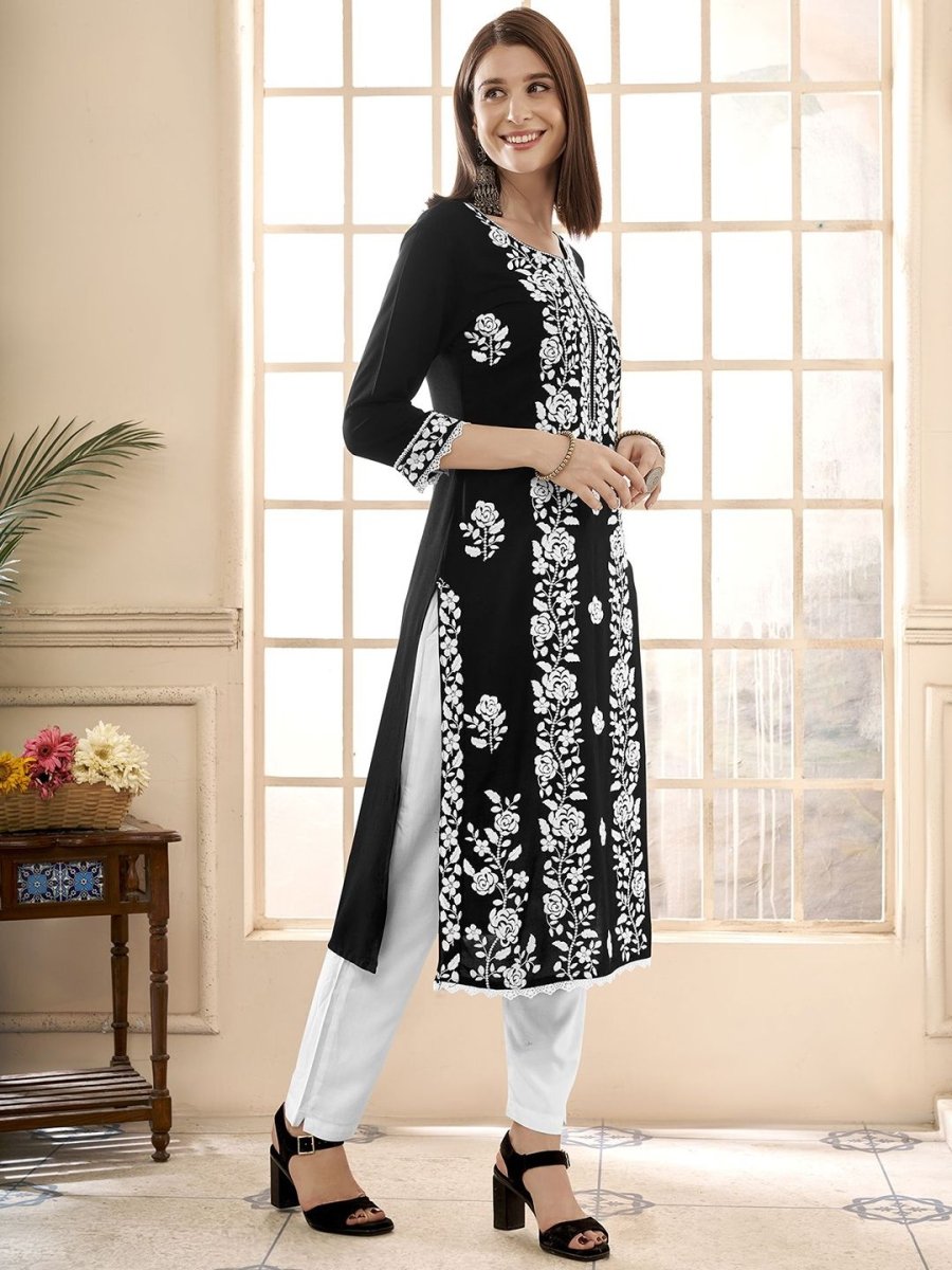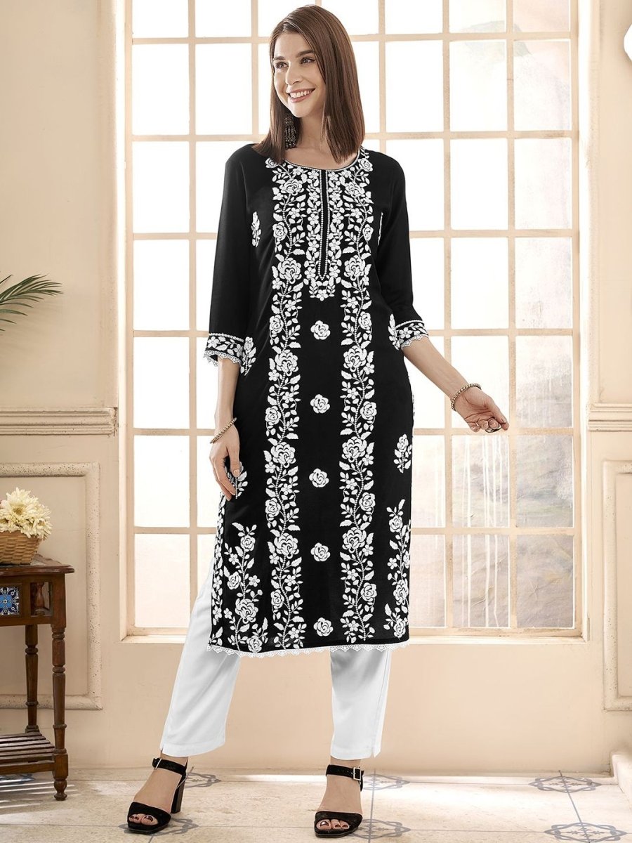 Anouk Floral Embroidered Round Neck Chikankari Straight Kurta Product Details Colour: black & white Floral embroidered Mandarin collar Thr...