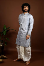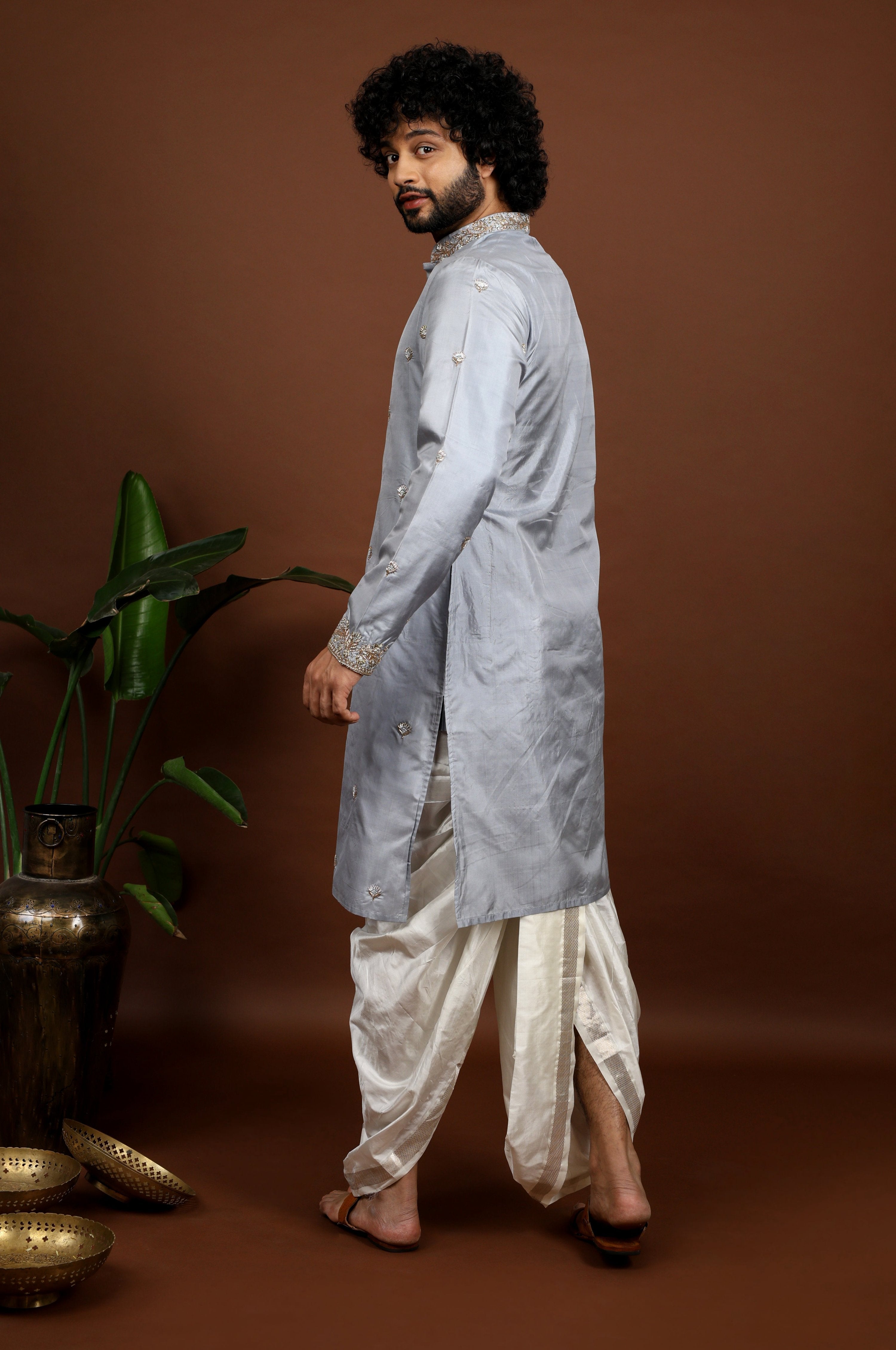 Enter a realm of timeless grace with the Pattu Elegance kurta set. The pure silk grey kurta harmoniously combines with a cream dhoti adorned with a delicate border in shades of peaches and blues, highlighted with intricate hand-embroidered zari and thread work. Elevate your style with hand-embroidered details at the collar and cuffs, adding a touch of refinement.