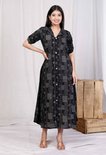This women Floral Printed black premium cotton Midi dress features oversized white buttons, simple Collar neck, and half sleeves. With a back dori tie up, it's perfect for both casual and formal events. Pair this black cotton western dress with ankle boots for a chic daytime look, or elevate it with heels and bold accessories for evening sophistication. Perfect for effortlessly transitioning from casual day time outings to elegant evening events, this versatile piece blends comfort with style