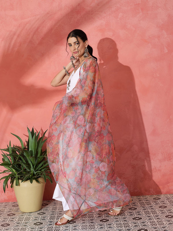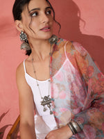 This stylish white strappy kurta set is paired with a soft and flowy green organza dupatta. The set balances simplicity and elegance, making it perfect for both casual and formal occasions. The light organza dupatta adds a graceful flair to the look, offering a fresh, contemporary aesthetic.