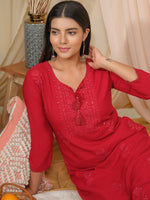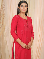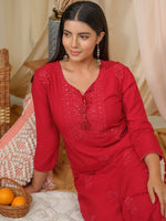 Ode by House of Pataudi Floral Embroidered Tie-Up Neck Thread Work Straight Kurta Product Details Colour: maroon Floral embroidered Tie up nec...
