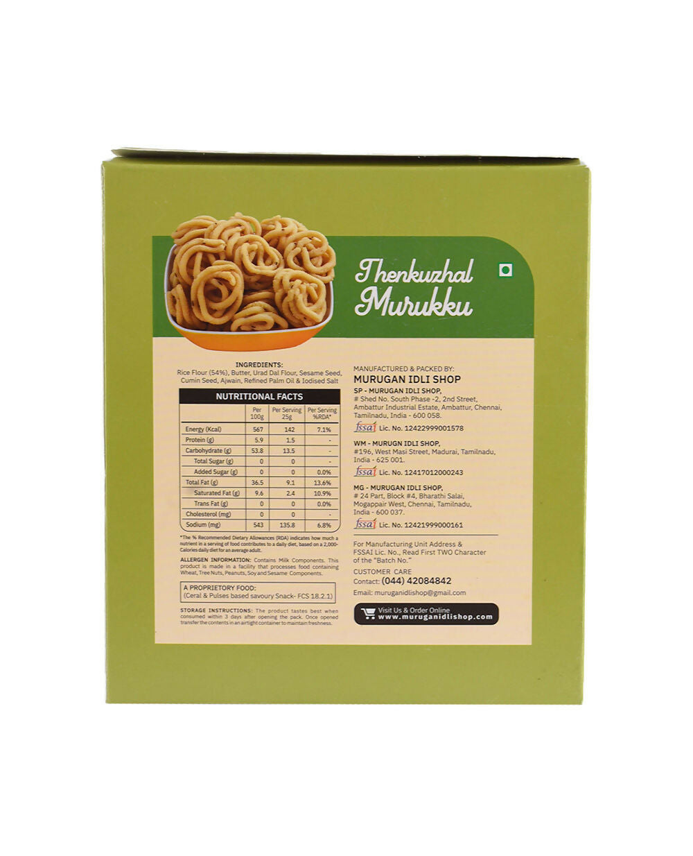 Murugan Idli ThenKulal is a traditional South Indian snack prepared in a distinctive coiled shape. It is known for its light and crisp texture and is often made using rice flour and sesame seeds. Commonly enjoyed during festivals or family gatherings, ThenKulal pairs well with tea, coffee, or other refreshments. Its unique design and cultural roots make it a popular choice for those who enjoy regional Indian snacks.