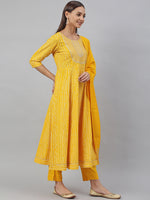 Janasya Women's Yellow Cotton Bandhej Kurta With Pant And Dupatta - XXXL