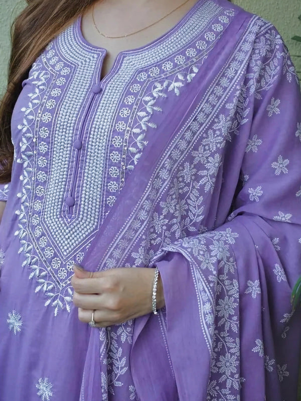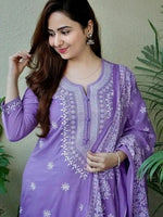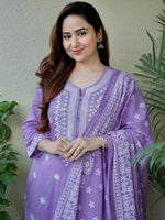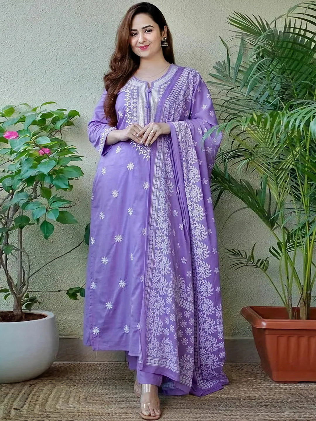 Kalini Ethnic Motifs Embroidered Pure Cotton Straight Kurta & Trouser With Dupatta Product Details Lavender & white kurta & trouser ...