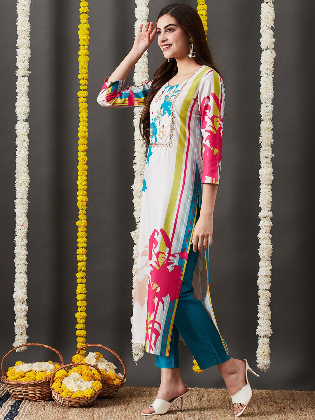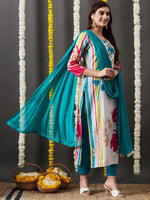 Cream-coloured, blue & pink printed kurta & trouser with dupatta