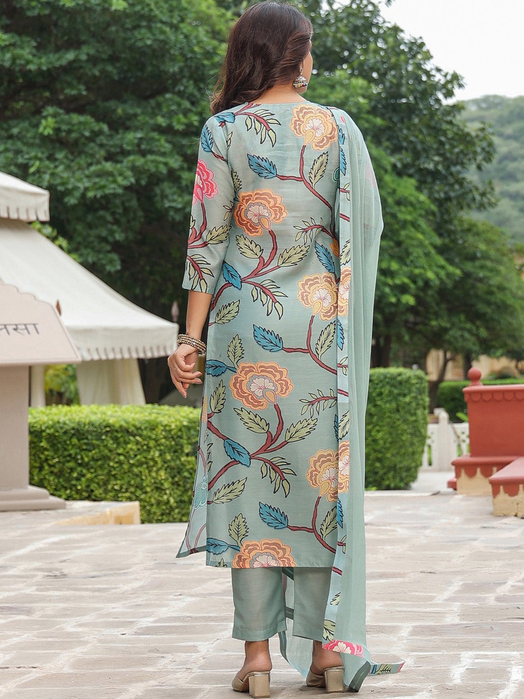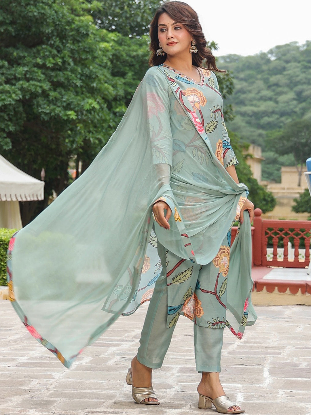 Kalini Floral Printed V-Neck Straight Kurta & Trousers With Dupatta