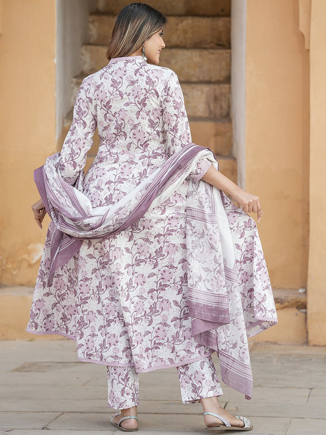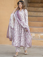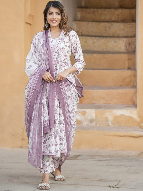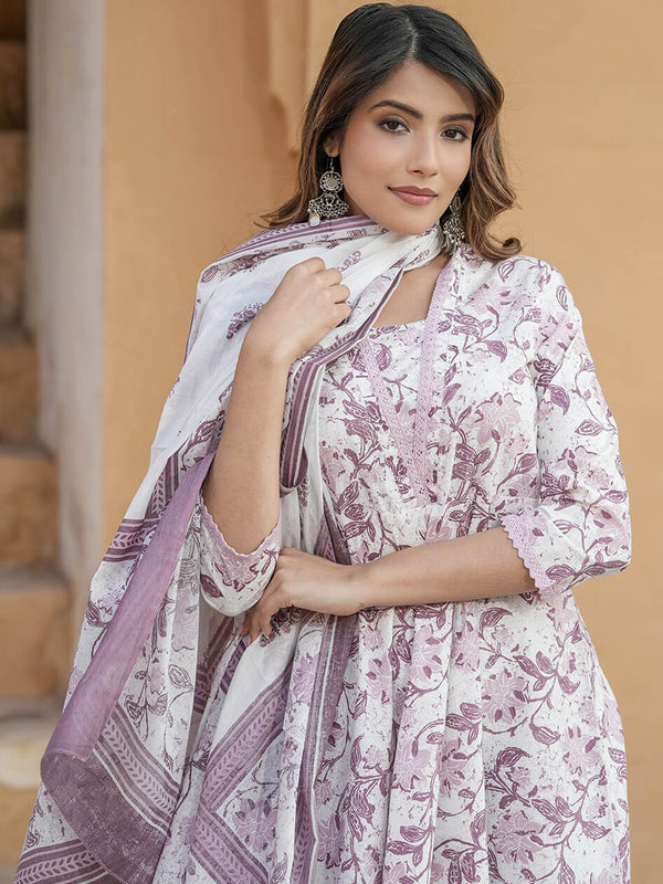 Kalini Floral Printed V-Neck Thread Work Anarkali Cotton Kurta with Trousers & Dupatta