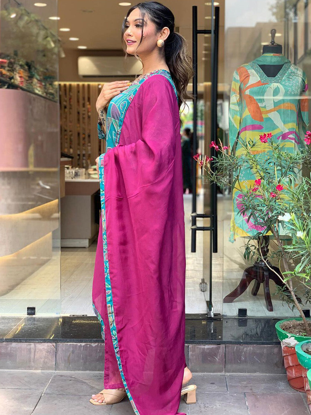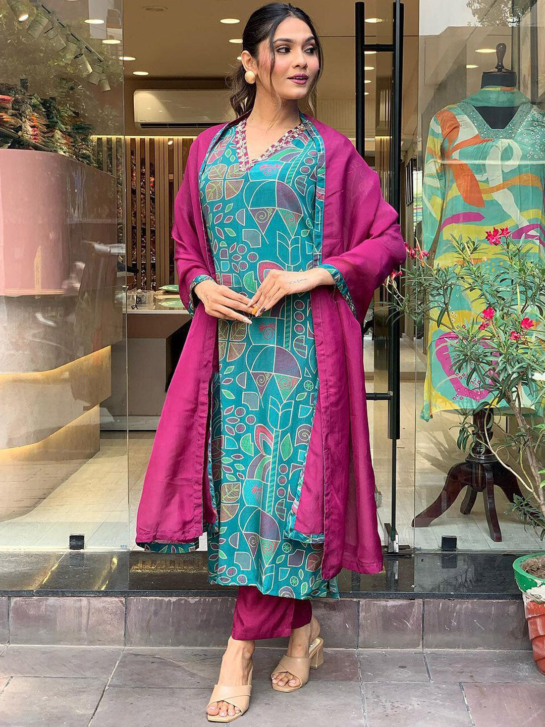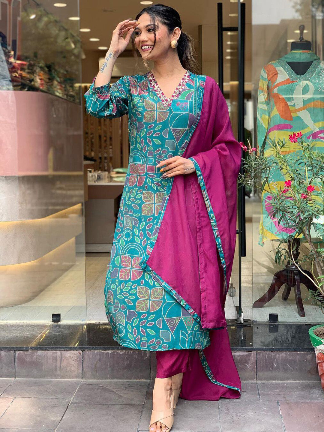 Kalini Floral Printed V-Neck Thread Work Regular Kurta With Trousers & Dupatta Product Details Sea green and pink regular kurta with trouser...