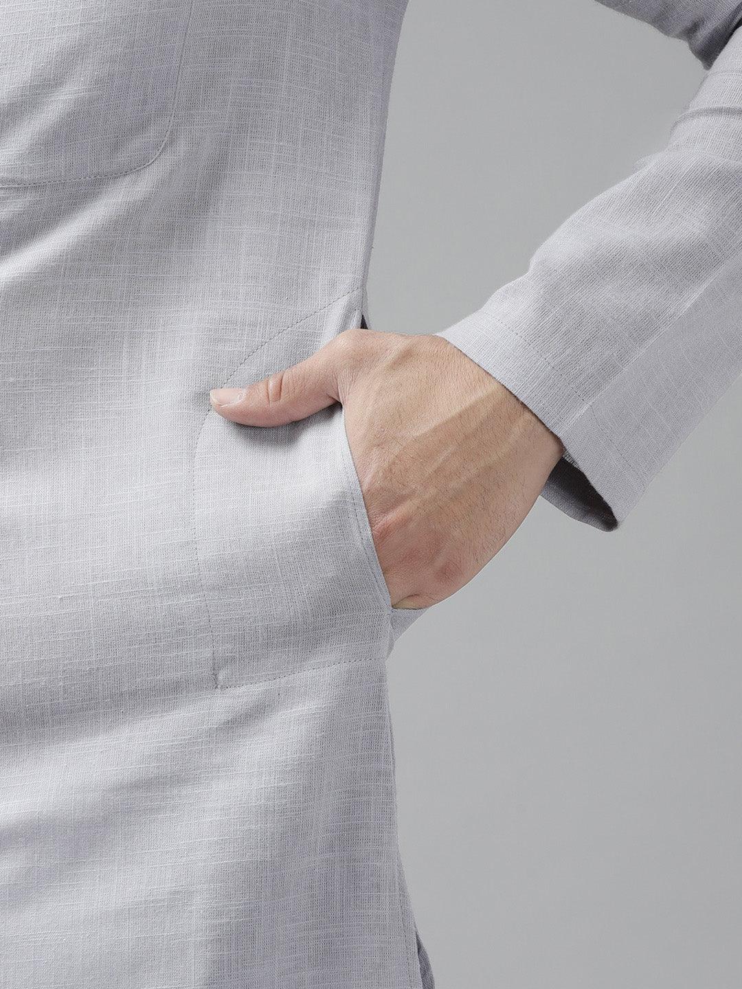 Men's Grey Cotton Straight Kurta with Linen Effect Modern Collar & Full Sleeves