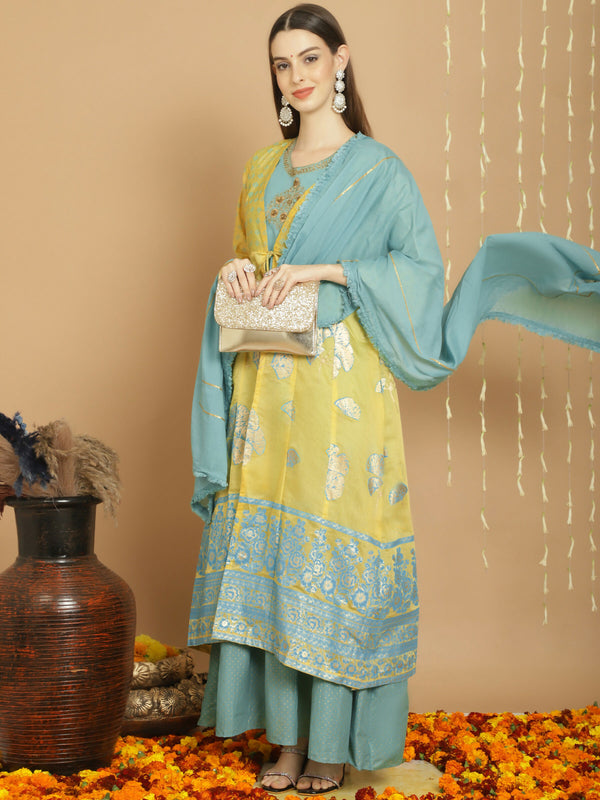 Jyoti Fashion Women's Yellow Chanderi Silk Elegant Jardoshi Kurta with Trouser & Dupatta