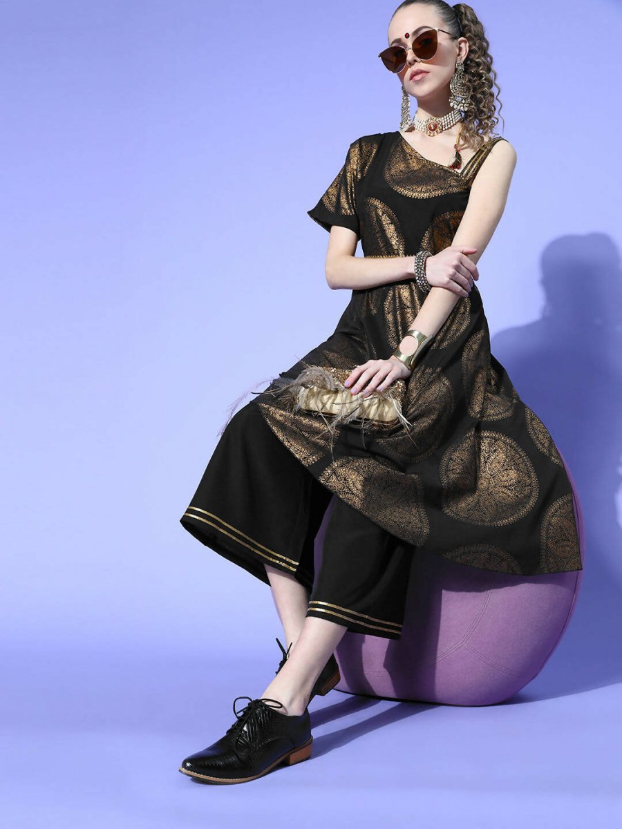 Ahalyaa Women Black Colour Crepe Printed Top Palazzo SetKeep up with the latest trends in desi fashion by opting for this fashionable kurta set. It...