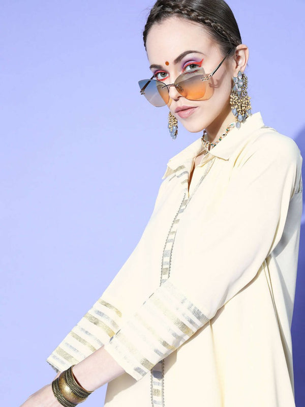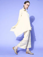 This clothing set consists of a Top Palazzo Set. made from Crepe fabric, it has a shirt collar and Long Sleeve, hip length, 1 side pocket, slip-on closure, partially elastic palazzo, and Silver & gold paste striped print. Every woman has to add this Teal color kurta set to her wardrobe. Keep up with the latest trends in desi fashion by opting for this fashionable kurta set