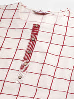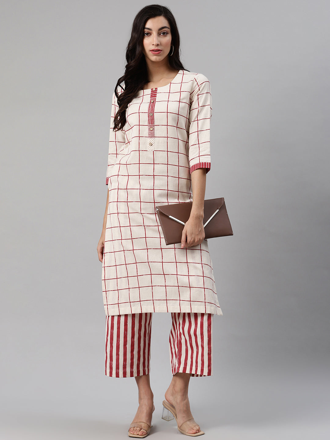 Off-White and maroon checked straight calf length kurta, has a round neck, three-quarter sleeves, straight hem, side slits