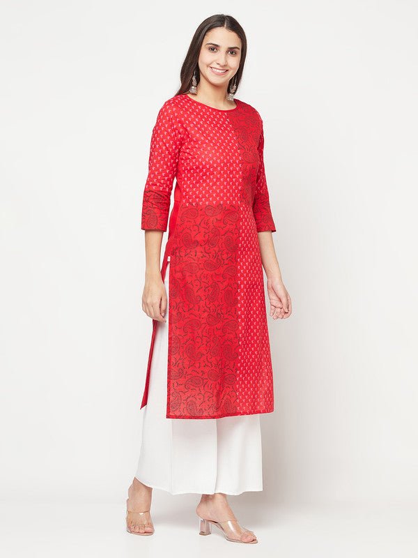 Aniyah Cotton Block Print Red Color Straight Kurta - S