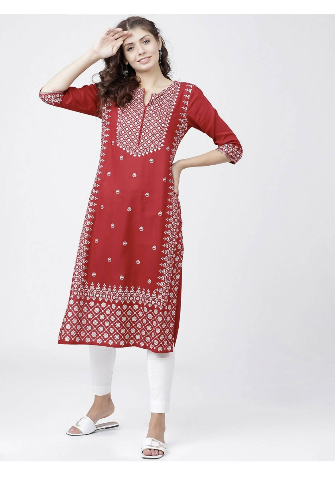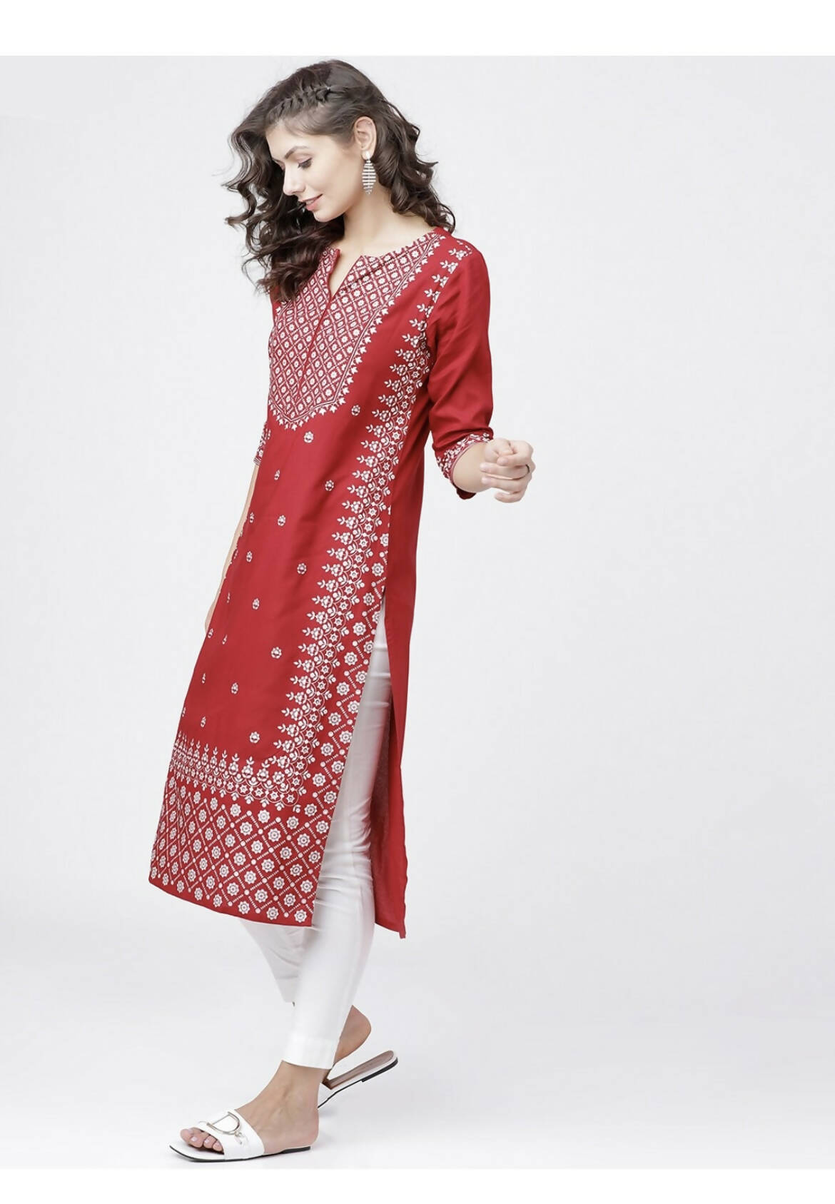 Cheera Embellished Daily Wear Cotton Blend Kurta - Red - Distacart
