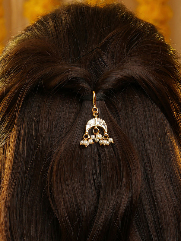 Presenting our gold-tone ethnic hair pin featuring a dangling jhumka bell design.These accessories are popular for creating a traditional look and are commonly worn for weddings, engagement ceremonies, festivals, and classical dance performances. The item is secured using a pin or comb mechanism that slides into the hair, designed for a secure and comfortable grip.Legal Disclaimer : Product color may slightly vary due to photographic lighting sources or your monitor settings.
