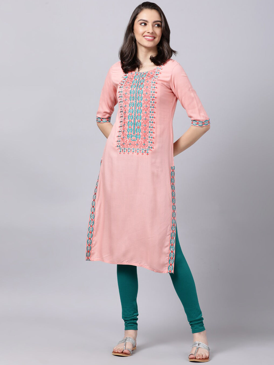 Souchii Women Peach-Coloured & Blue Ethnic Motifs Yoke Design Thread Work Pastels Kurta Product Details Colour: peach-coloured and blue Eth...