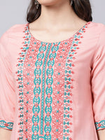 Souchii Women Peach-Coloured & Blue Ethnic Motifs Yoke Design Thread Work Pastels Kurta