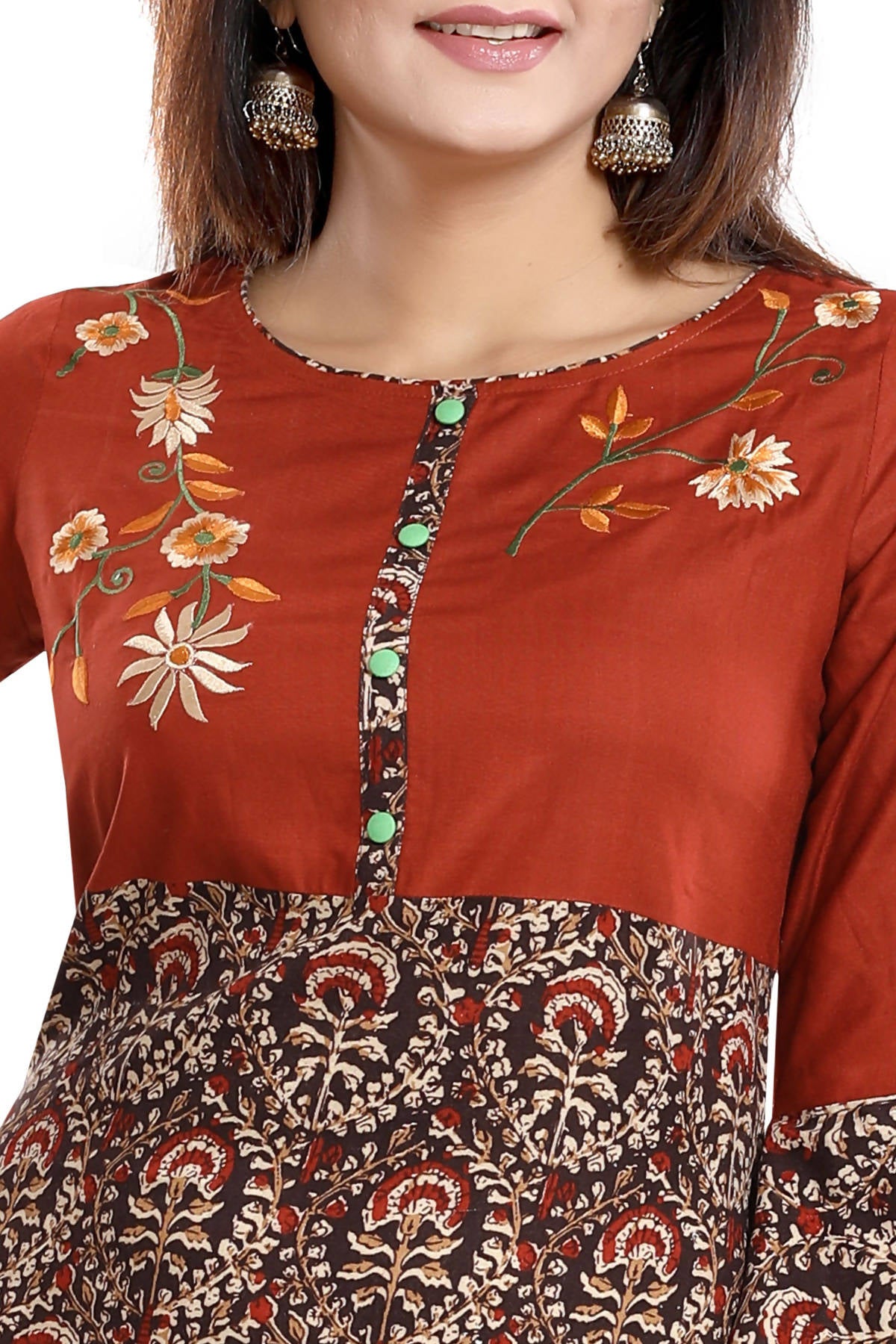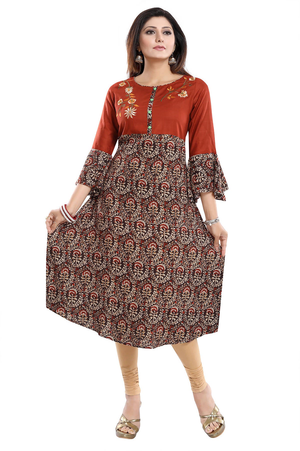 Snehal Creations Rust Rayon Printed Flared Long Tunic