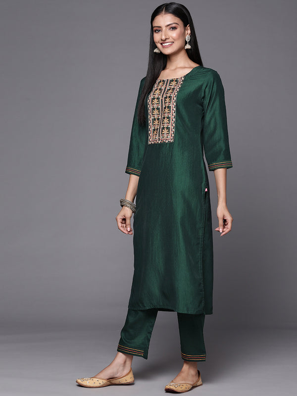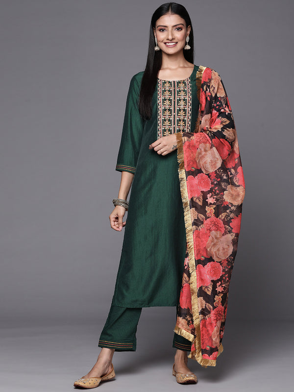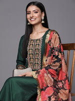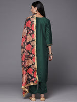green embroidered kurta with digital printed dupatta and straight pant,straight kurta,thread yoke embroidery,round neckline,dobby fabric kurta,3/4th sleeves