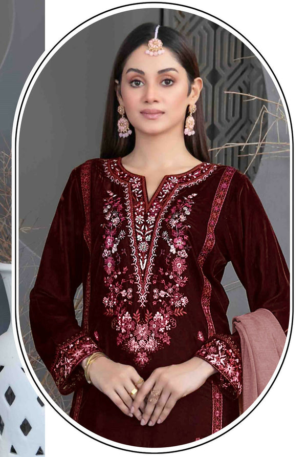 Anaita Maroon Velvet Suit with Embroidery Sequence Work Length of Kurta: 42 Kurta Style: Straight Kurta Fabric: velvet Kurta Colour: Maroon Ku...