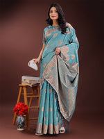 Astita Teal Blue Linen Cotton Saree with Woven Geometric Zari Motifs - Elegant Festive Wear for Women