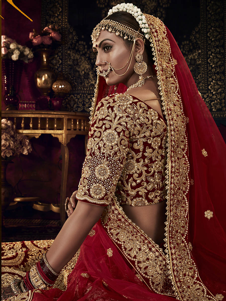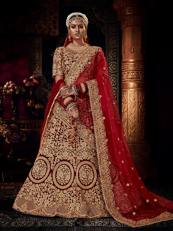 Red Heavy Embroidered Bridal Designer Lehenga features a high quality can can with 9ooo velvet lehenga with velvet blouze with net dupatta. Embroidery is completed with thread , sequins , dori and stone work. This Style is made in India and checked by hand to ensure high quality.