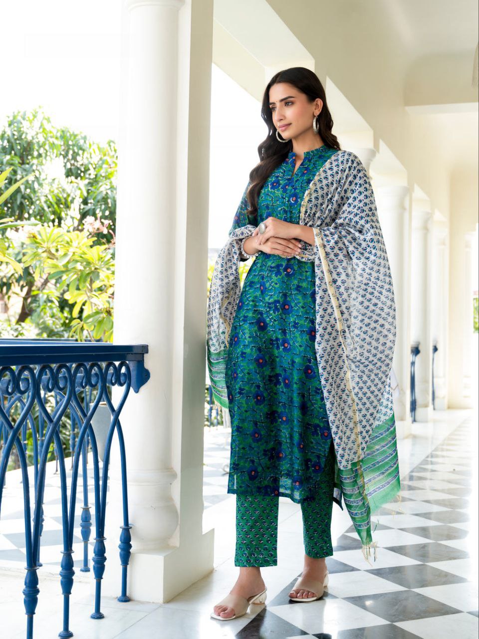 NOZ2TOZ Women's Floral Printed Knee Length Kurti And Pant Set With Printed Dupatta - Blue - Distacart