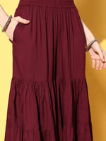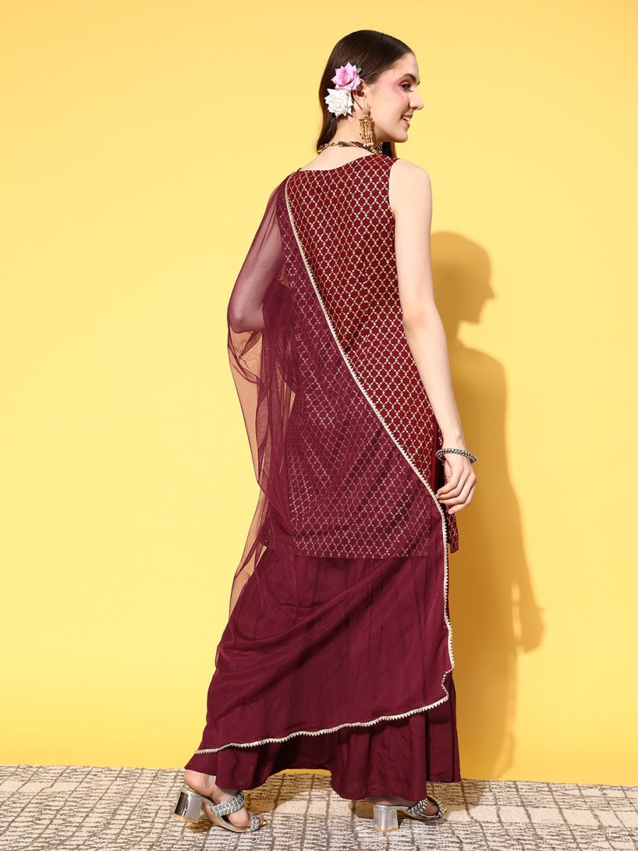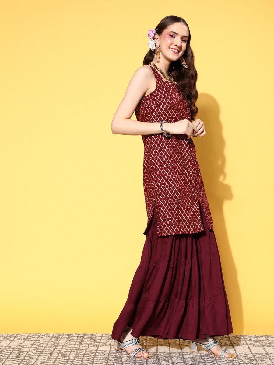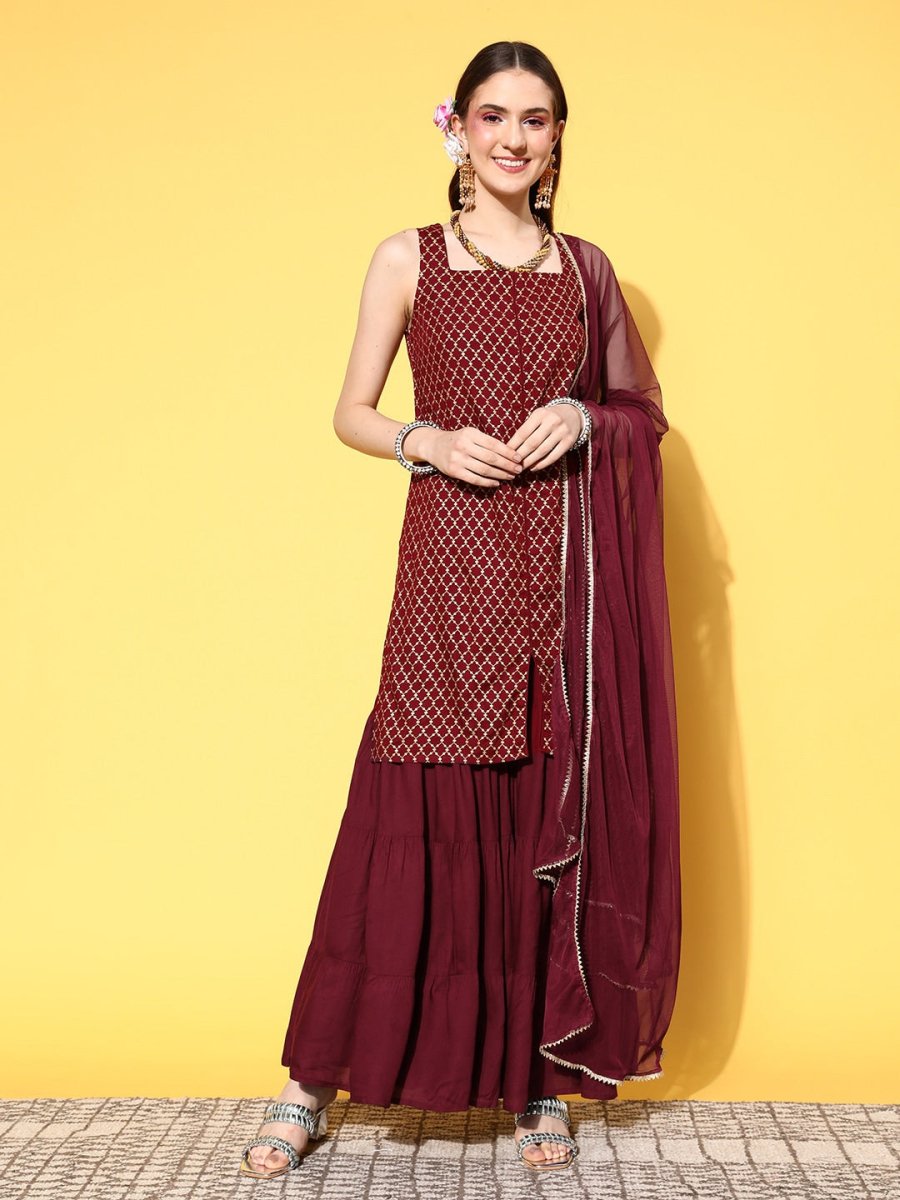Designed in a wide array of patterns, right from polka dots, ombre, and Warli to embellished and quirky prints, fusion bottoms and sets blend traditional charm and modish details. They often sport asymmetric hemlines, flares, slits, and sheer detailing.