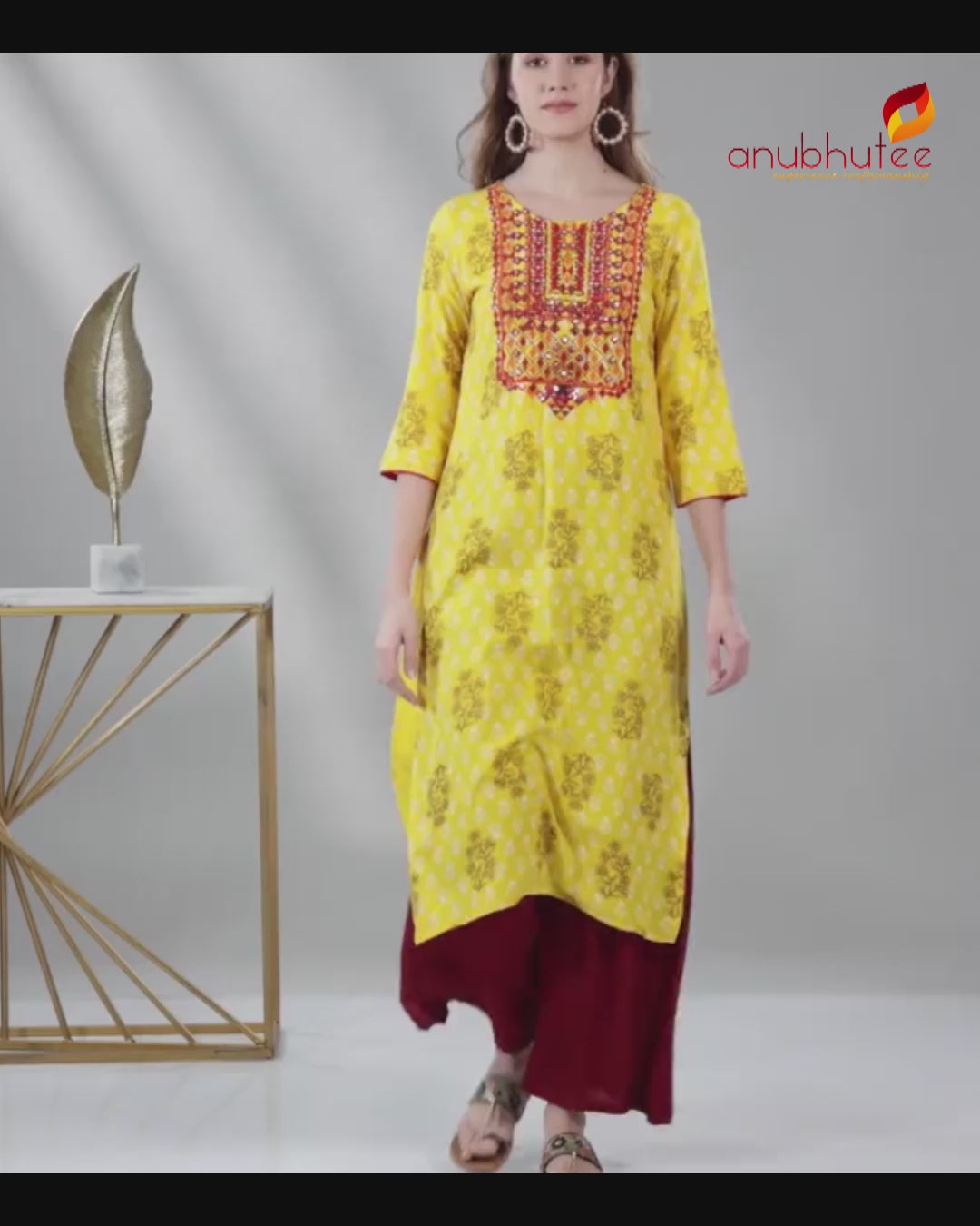 Anubhutee Mustard Yellow & Brown Screen Printed Straight KurtaMustard yellow and brown screen printed straight kurta with mirror and embroidere...
