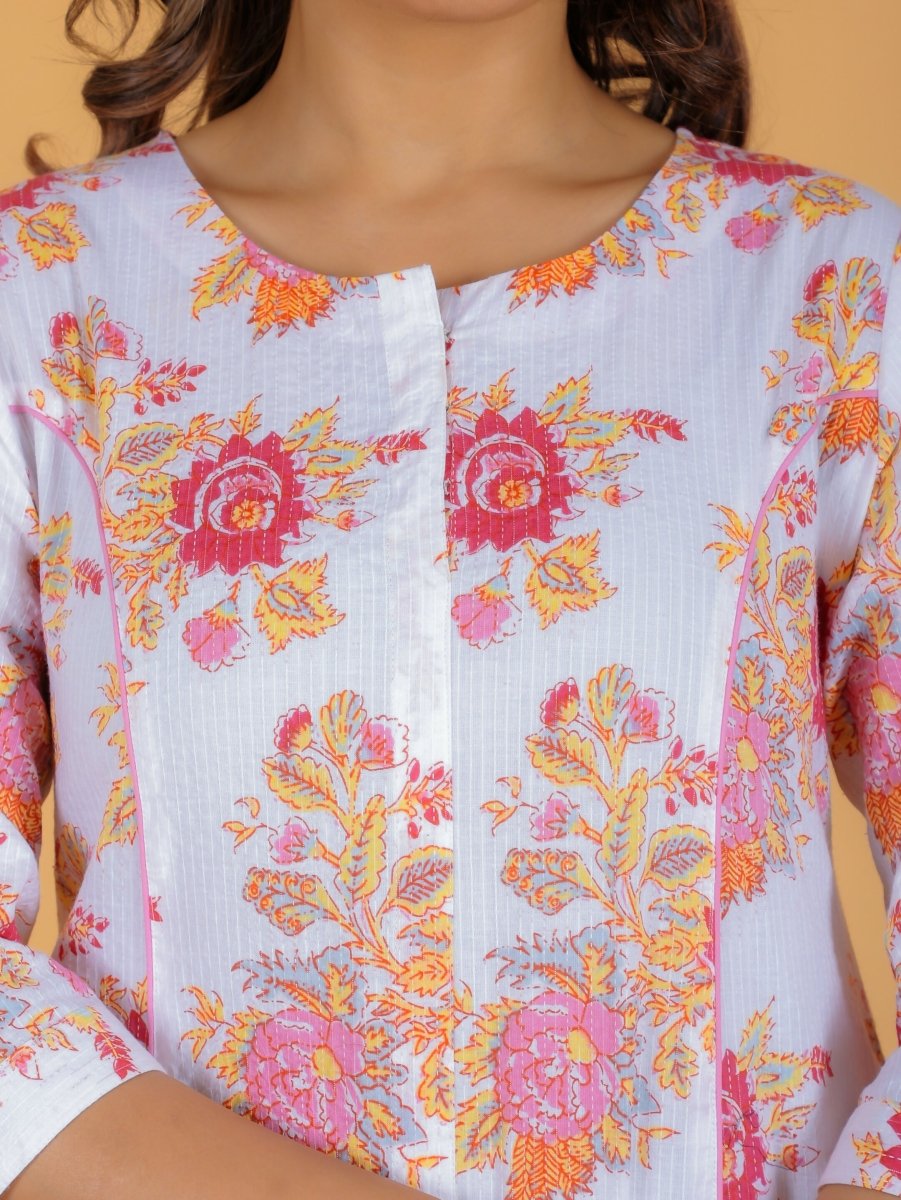 Aramya A-line Kantha Cotton Floral Print Women's Kurta - WhiteElevate your style with our uniquely designed kurta, perfect for daily wear or casual...