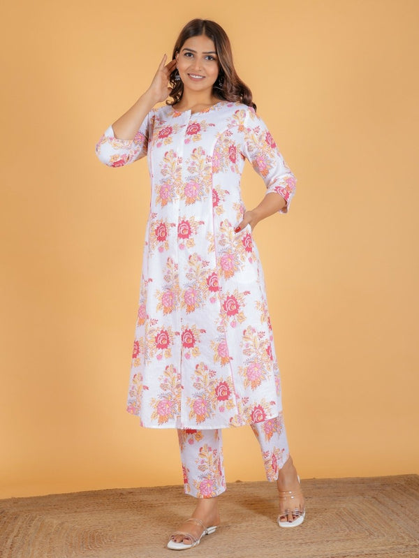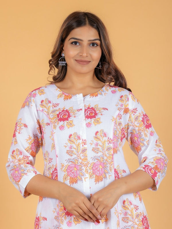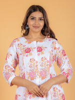 Aramya A-line Kantha Cotton Floral Print Women's Kurta - White