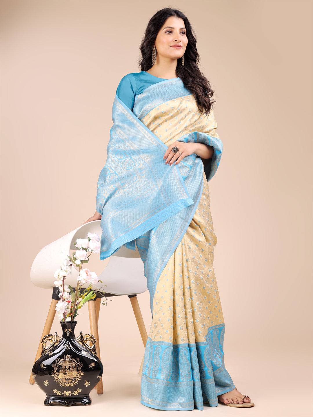 • Saree Color: Cream & Sky Blue