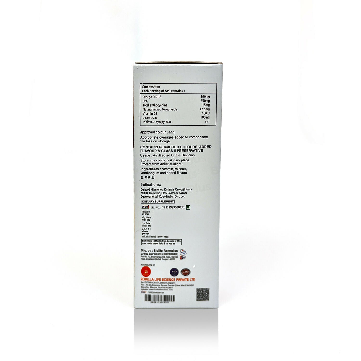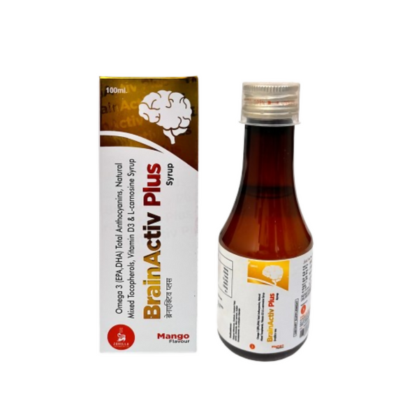 BrainActiv I Plus Syrup is a dietary supplement formulated with omega-3 fatty acids (EPA and DHA), Vitamin D3, L-Carnosine, Total Anthocyanins, and Natural Mixed Tocopherols. The product is available in liquid form and is designed as part of a daily nutritional routine. It is manufactured by Zorilla Life Science.