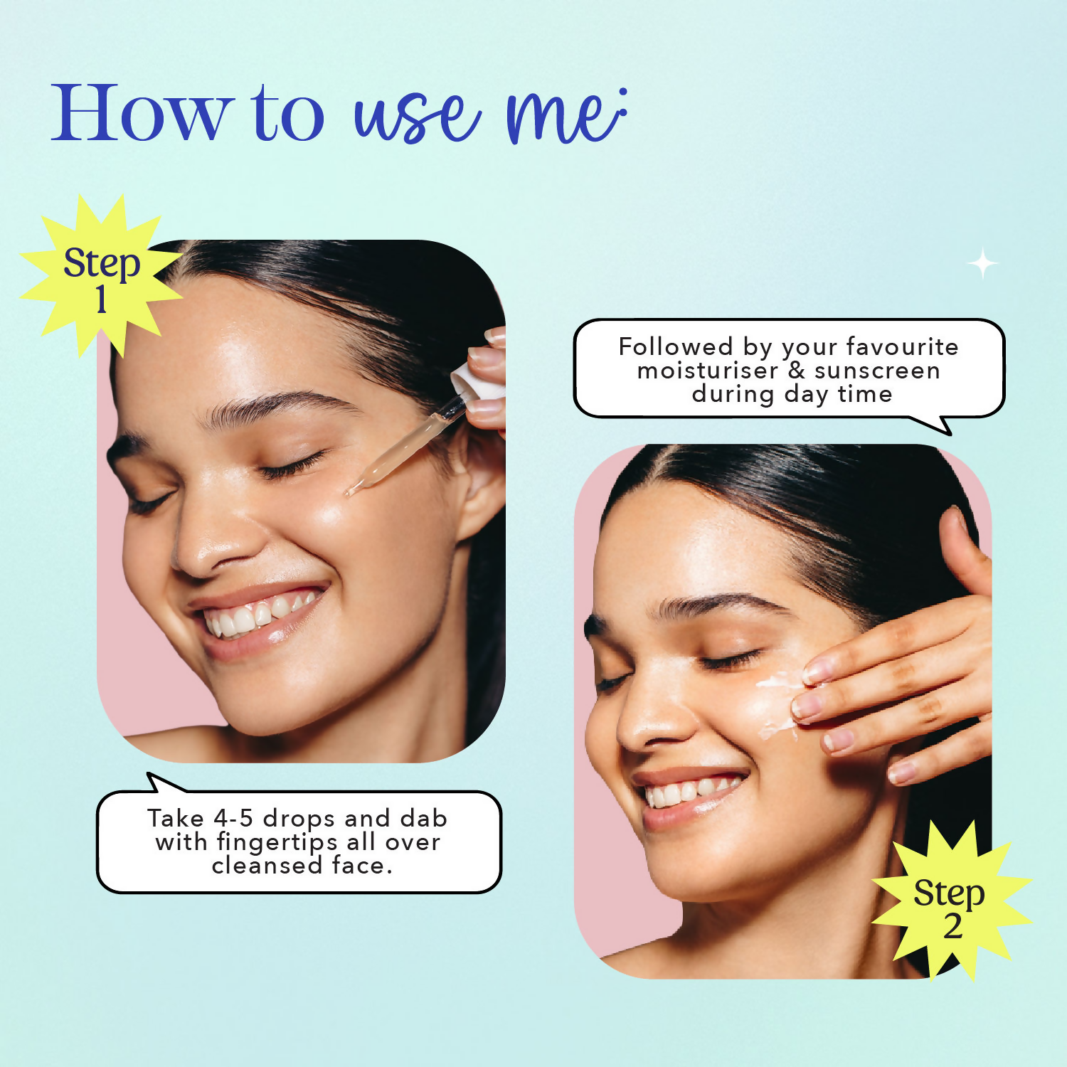 • Step 2 : Follow it up with moisturiser & sunscreen during day time