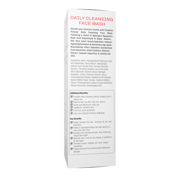 • People with skin discoloration, acne ,Dark spot and pigmentation Experience a radiant, refreshed complexion with Flawless finesse DAILY CLEANSING FACEWASH Daily Cleansing Facewash – a powerhouse formula designed to gently cleanse, hydrate, and brighten your skin. This advanced Daily Facewash combines cutting-edge skincare ingredients, including Hydrogen Aquaporin, Niacinamide, Kojic Acid, Alpha Arbutin, and a blend of exfoliating acids, to deliver an effective yet soothing cleanse. Perfect for everyday use, Flawless finesse