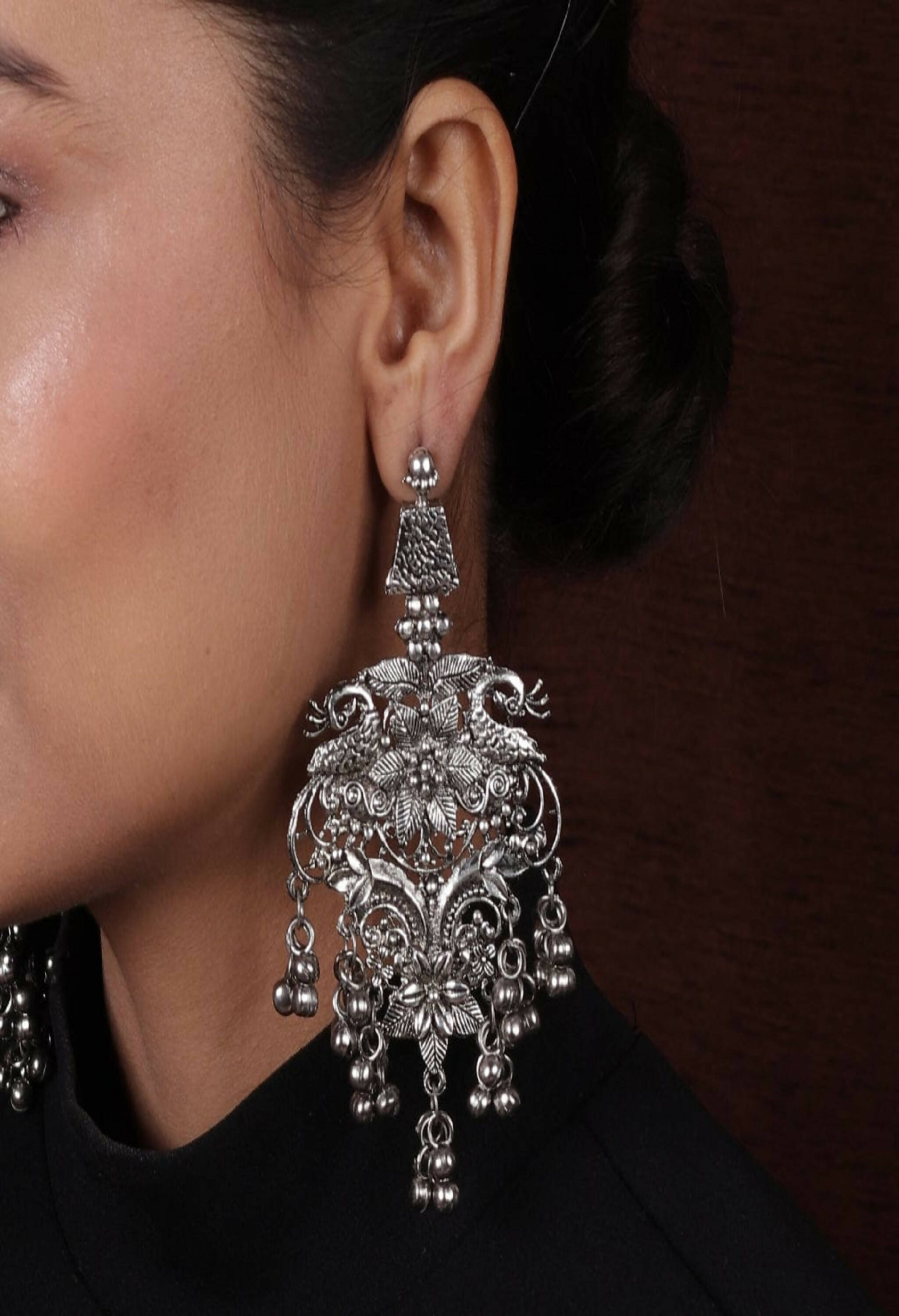 Mominos Fashion Joharkamal Silver-Plated Peacock Design Drop Earrings For Women Style/Collection: Oxidised Actual Color: Silver Product Type: Ea...