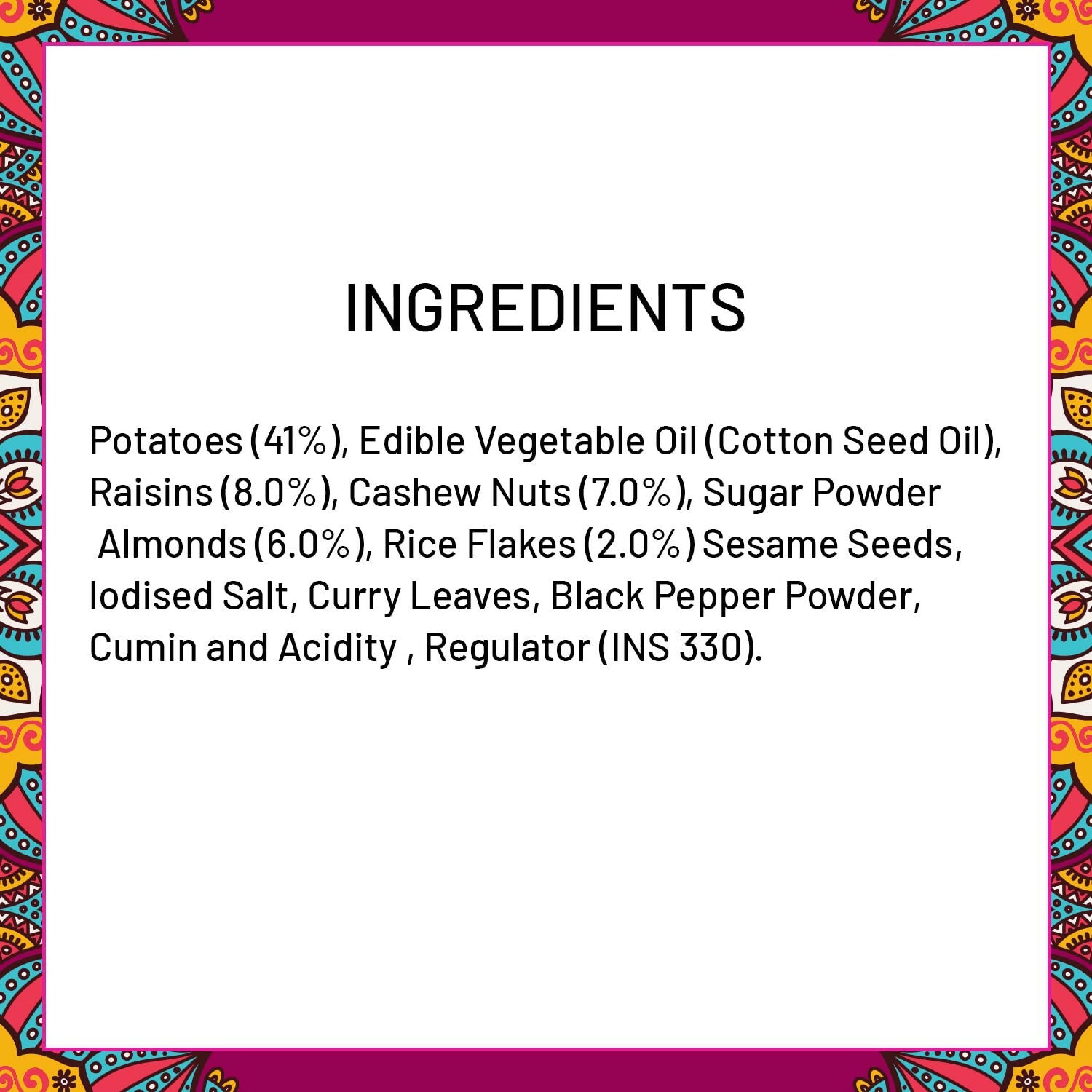 • Snack Variety: Includes a mix of nuts and spices typically found in Indian snack mixes.