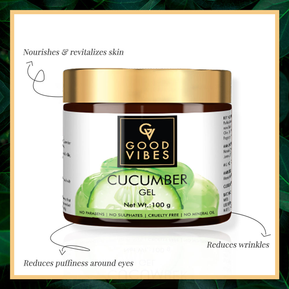 Why choose Good Vibes Cucumber Gel as it gets rid of excessive oil in skin leaving it with a glow!. Enriched with anti-inflammatory properties, this gel soothes irritated and inflamed skin. Packed with anti-oxidants that reduce the likelihood of redness, puffiness and blemishes for clear, radiant skin!. An effective moisturizer that transforms dull, dehydrated skin into healthy skin!. It maintains the elasticity of your skin to make sure it remains young and supple!. Its soothing properties heal sunburns and rashes for a flawless complexion!