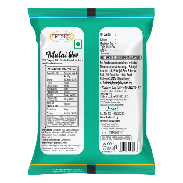 • Patanjali Namkeen Malai Sev, a high-quality snack offered by Patanjali, is a delectable treat made from Bengal gram. This savory Sev is blended with Moth Bean flour and a medley of aromatic spices. With a delightful hint of milk, it serves as an ideal accompaniment to your tea.