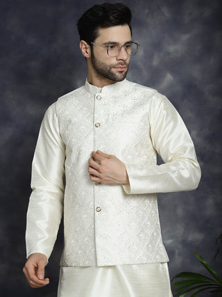 Jompers Men's off-White Solid Kurta Pyjama with Cream Woven Design Nehru Jacket