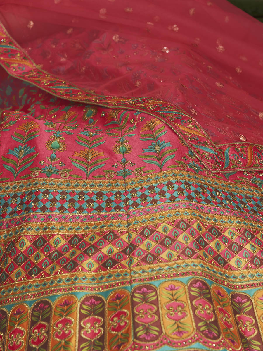 Pink Art Silk Embroidered Designer Lehenga features a art silk lehenga with art silk choli with net dupatta. Embroidery is completed with thread and print work. This Style is made in India and checked by hand to ensure high quality.