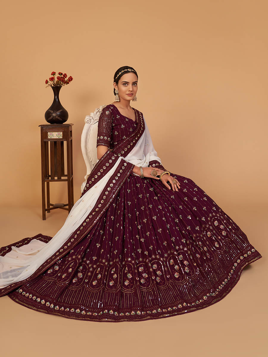Myra Plum Georgette Embroidered Designer Lehenga - Distacart